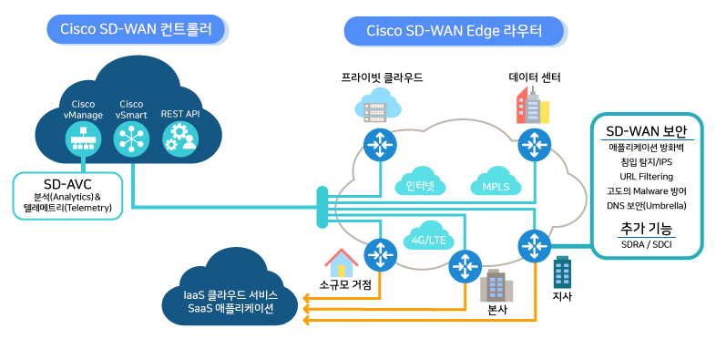 Cisco SD-WAN은 MPLS, 인터넷, 4G LTE 등과 같은 다양한 연결에 WAN을 제공하여